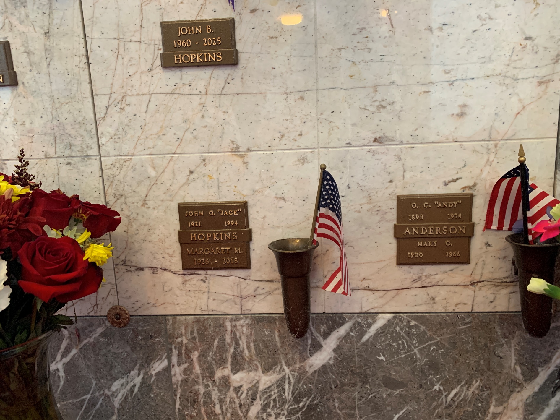 Rich’s youngest brother John passed away this past May at 64. It was unexpected, even though he had previous health issues. We were shocked. He is now next to his parents and Anderson grandparents. The space next to him is reserved for us, should we choose to use it.