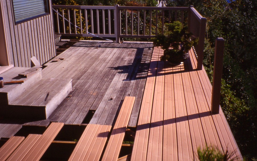 of removing the old decking, preparing and painting the joists underneath