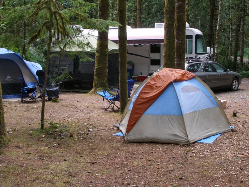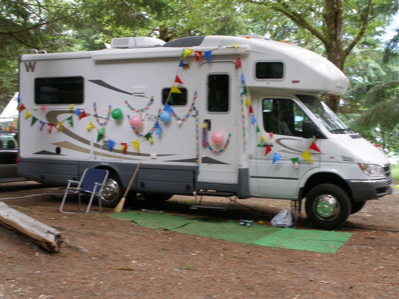 While Susan was in Chicago playing Auntie, Rich attended the annual Baker Lake cult event. This year, he stayed the entire week. Without Susan to object, he was able to retro to his old camping tent amongst a forest of RVs. This included George and Maggie’s new motor home, which was quickly christened in traditional Baker Lake style. Fortunately for the tenters, the rains held off until day 5.